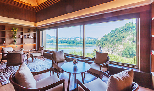 The restaurant’s design introduces a concept of “lights of fishing boats on Lijiang River”. The French window achieves a limitless extension of the indoor space. With the wonderful landscapes of Elephant Trunk Hill and the river outside the window, the restaurant and the landscapes are blended as a whole. On the open viewing platform outdoors, you can enjoy a zero-distance panorama of Elephant Trunk Hill.