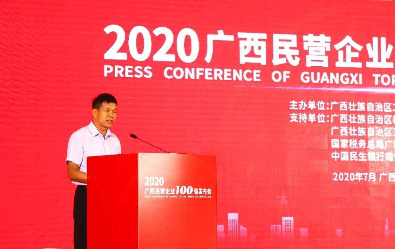 7月31日下午,广西自治区工商联在南宁举办2020广西民营企业100强发布会,自治区党委常委、统战部部长徐绍川,自治区人大副主任、民进自治区主委杨静华,自治区副主席费志荣,自治区政协副主席、自治区工商联主席磨长英,自治区人民政府副秘书长、一级巡视员黄植建出席会议。自治区党委统战部副部长、自治区工商联党组书记熊春寒主持会议,自治区工业和信息化厅、科技厅、广西税务局、民生银行南宁分行4家支持单位领导,各市工商联主席、书记,上榜企业代表,中央驻桂媒体和自治区各大新闻媒体记者200多人参加发布会。
